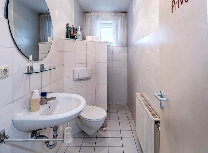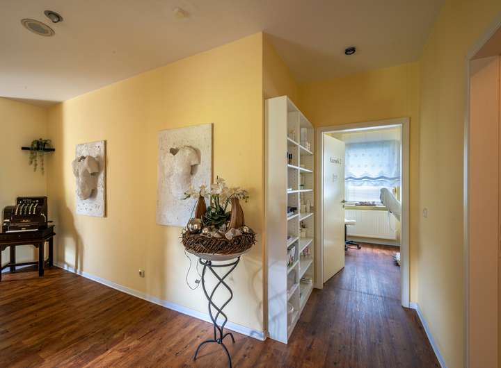 Aktuell wird das Erdgeschoss als Kosmetikpraxis betrieben. Die Räume sind funktional geschnitten, barrierefrei zugänglich und können flexibel an andere Nutzungsarten angepasst werden – z.B. als Büro oder Atelier.