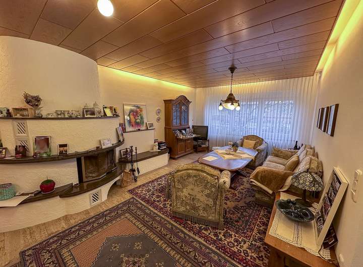 - Gemütliches Kaminzimmer mit Holzdecke für behagliche Abende