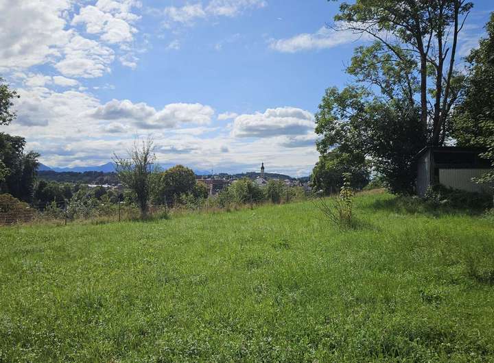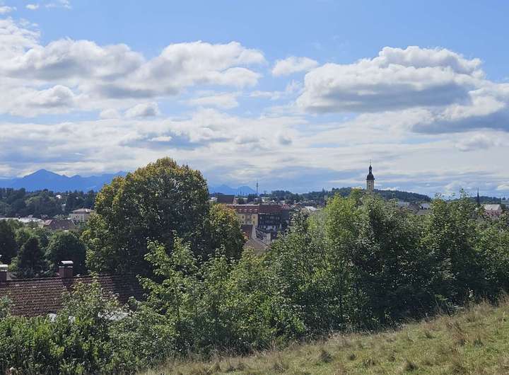 Das 2.619qm Baugrundstück befindet sich in Traunstein mit Blick über die Stadt und die Chiemgauer Alpenkette.