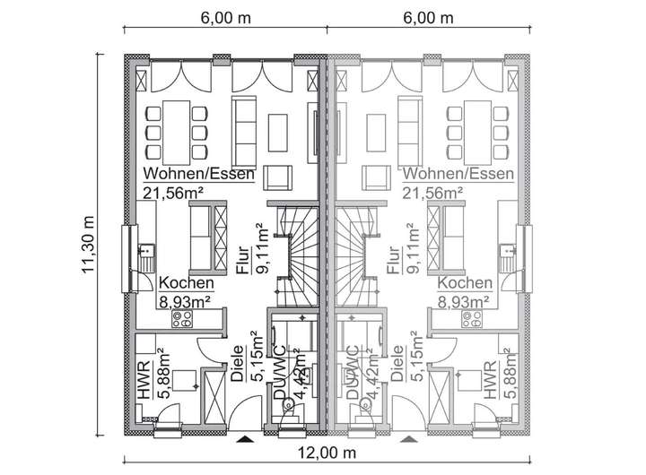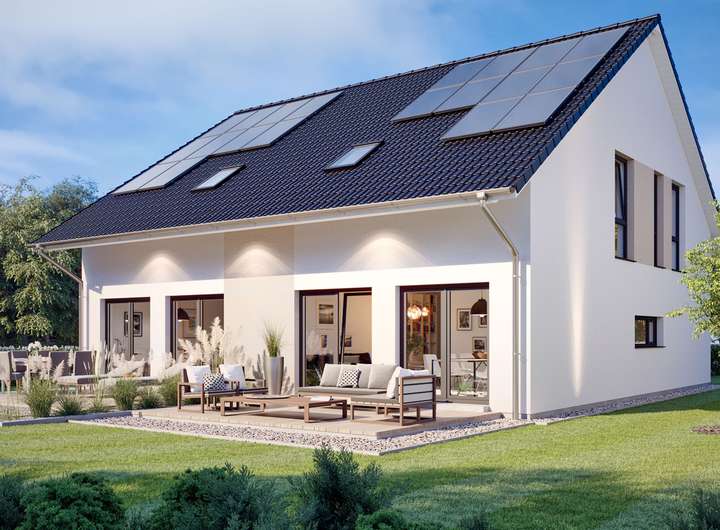 Das Doppelhaus zeichnet sich durch geschickte Belichtung aus. Verschiedene Fensterformate wie bodentiefe Fenster, Oberlichtfenster belichten Wohn- und Essbereich aus. Es bietet auch ein Gäste-WC mit Duschmöglichkeit und einen Hauswirtschaftsraum in der Nähe der Küche für zusätzliche Funktionalität als Vorratskammer.