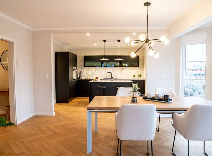 Beim Betreten des Hauses gelangt man in einen Flur mit Nischenlösungen für eine große Garderobe. An den Flur grenzt ein Bad und einen Hauswirtschaftsraum. Die zentrale Küche ist durch ein elegantes Fensterband gut belichtet und mit dem offenen Wohn- und Essbereich verbunden, der sich über die gesamte Breite des Hauses erstreckt und von zwei bodentiefen Fenstern belichtet wird.