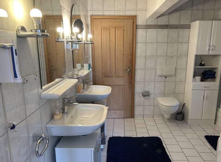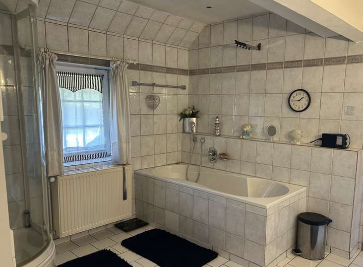 Das großzügige, tagesbelichtete Bad verfügt über ein Doppelwaschbecken, eine Wanne und eine großzügige Dusche.