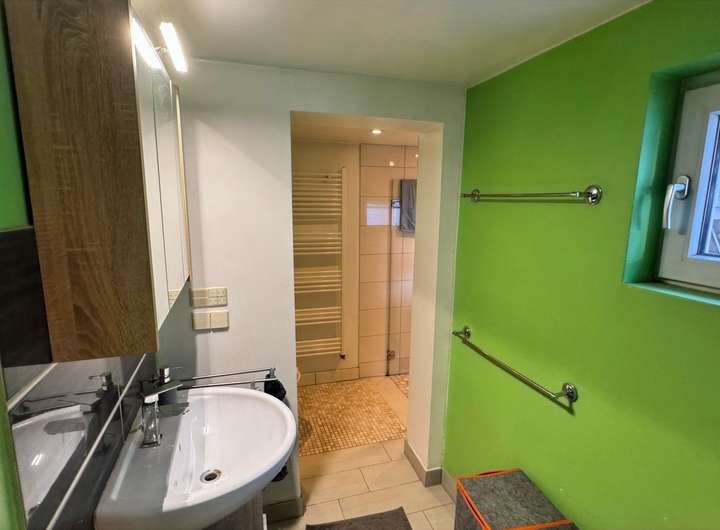 Das Tageslichtbad ist gefliest und mit bodengleicher Dusche ausgestattet.