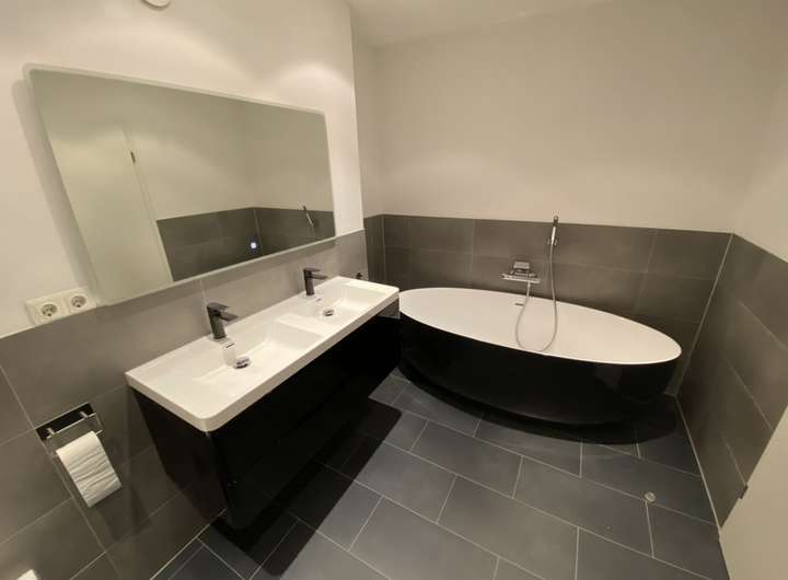 Hier erwarten Sie zwei großzügige Schlafzimmer sowie ein stilvolles Badezimmer mit freistehender Badewanne, begehbarer Dusche und exklusiven Armaturen.