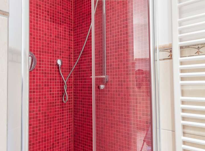 - in Sandtönen gefliestes Badezimmer mit großem Fenster, WC, Waschtisch und rot gefliester Dusche.