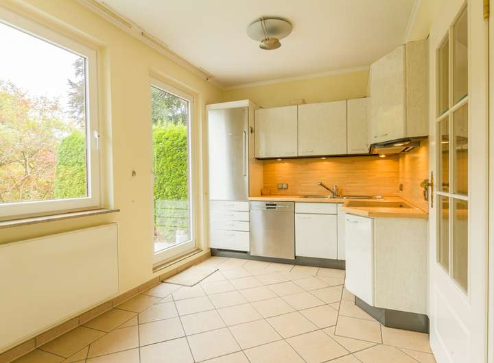 - Küche, ausgestattet mit gepflegtem Einbauprogramm, hellen Fronten, Arbeitsplatte in Holzdekor, Herd mit Cerankochfeld, Dunstabzug, Geschirrspüler und Kühlschrank sowie Zutritt zur sonnigen Südterrasse (mit Markise)