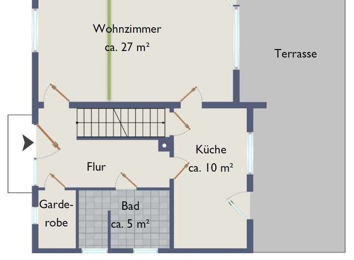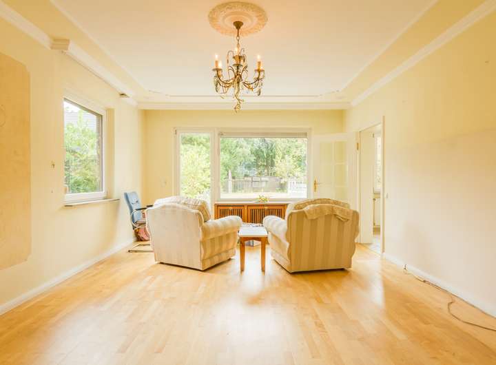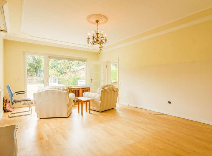 - geräumiges Wohnzimmer, ausgestattet mit Echtholzboden, edlen Zierleisten an der Decke und einer großen Fensterfront mit Zugang zur Terrasse