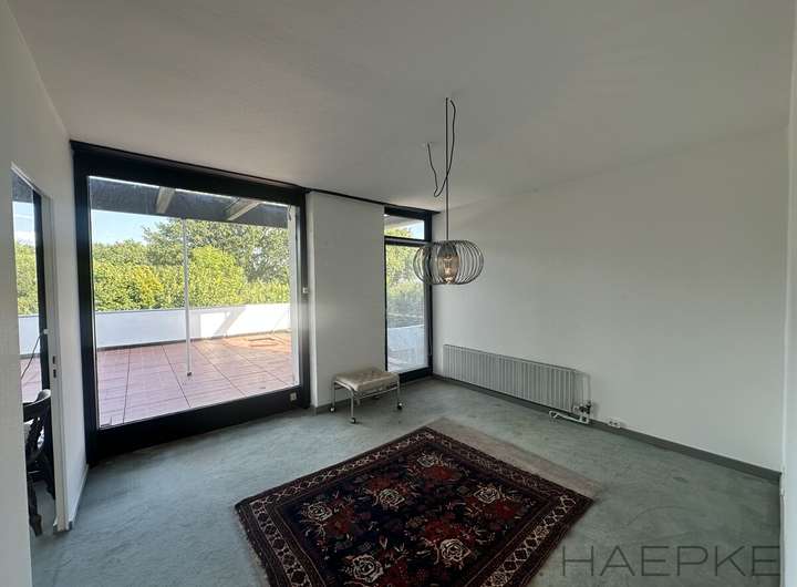 Vorgelagert – ebenfalls auf EG-Ebene – liegen neben dem Eingangsbereich des Hauses: eine Einbau-Garderobe im Stil der 1960er sowie angrenzend ein Gäste-WC mit Fenster. Der überdachte Essplatz (ehemals Patio), bildet den Übergang zum Garten vom Essbereich, und lässt sich in den Herbst-Wintermonaten stimmungsvoll beleuchten oder kann in den kühleren Monaten als Wintergarten genutzt werden. Von hier lässt sich die Terrasse mit einem Ofen und Außenkamin betreten, die das ganz Jahr für Urlaubsfeeling sorgt. Ergänzt wird das Raumprogramm des EG durch die Küche, die zum Kochen einlädt und sich ggf. auch zum Essplatz hin öffnen lässt. Über ein Büro im EG hinaus befinden sich drei weitere Zimmer und ein Wannen-Duschbad im OG. Zudem bieten eine Terrasse im OG, eine Doppelgarage, ein Doppelcarport und 8 Stellplätze weiteren Wohnluxus.