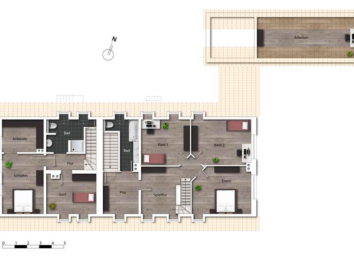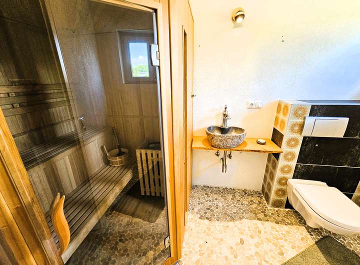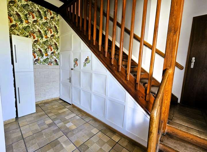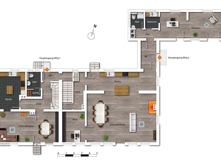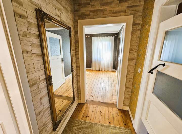 Historisches, altes Schulhaus mit modernem Flair in traumhafter Hunsrück-Landschaft! Dieses um 1953 in Massivbauweise erstellte, sehr geräumige, ehemalige Schulhaus in der Hauptstraße des kleinen Örtchens Mörschbach gelegen, präsentiert sowohl einer Familie mit Kindern und/oder Tieren, Tier- und Naturliebhabern, auf ca. 325 m² Wohnfläche und 1.698 m² Grundstücksgröße, genügend Platz zum Wohnen und Wohlfühlen. Wohnung 1 (ca. 111 m² Wohnfläche) Die Wohnung verfügt über zwei separate Eingänge: den Haupteingang - auf der Rückseite des Hauses gelegen und den Nebeneingang, vom Parkplatz und Garten her zu erschließen. Über eine kleine Außentreppe und einen Windfang, der als ehemalige Lehrerwohnung auch den Zugang zum ehemaligen Schulhaus darstellen kann, erreicht man die sich im Erdgeschoss befindlichen Räumlichkeiten: Küche mit moderner Einbauküche im Landhausstil, Wohn- und Esszimmer mit dem WLAN-fähigen Pelletofen, welcher auch in der kälteren Jahreszeit Wärme und Behaglichkeit spendet und dem damit verbundenen Gartenzugang. Die zahlreichen Fenster sorgen für eine hell, lichtdurchflutete Atmosphäre und das Zusammenspiel aus Dielen und Deckenpanellen aus Holz vermitteln hier zusätzlich Gemütlichkeit. Daneben befindet sich ein Badezimmer mit Sauna und Mosaikfliesen aus Natursteinen als Bodenbelag im modernen Stil. Über ein offen gehaltenes Treppenhaus erreicht man die beiden Schlafräume im Dachgeschoss - eines großzügig und mit begehbarem Ankleidezimmer, das andere etwas kleiner, hervorragend geeignet als Kinder-/ Gäste- oder Arbeitszimmer. Auch auf dieser Ebene befindet sich ein Badezimmer, hier allerdings mit begehbarer Dusche und Zugang zum Spitzboden. Wohnung 2 (ca. 221 m² Wohnfläche) Diese Wohnung ist durch einen Windfang zu erreichen, der den Wohn- und Arbeitsbereich verbindet. In Richtung Wohnbereich gelangt man zunächste in die offene Küche mit großzügiger Einbauküche und Kochinsel sowie dem ehemaligen Schulsaal. Dieser beeindruckt durch seine markante Sichtbalkendecke, dem ursprünglichen Dielenboden und den zahlreichen Fensterflächen, die ein ganzjährig lichtdurchflutetes Wohnen ermöglichen. Ein moderner Pelletofen sorgt in der kalten Jahreszeit für zusätzliche Behaglichkeit. Insgesamt stehen hier ca. 75 m² Wohnfläche zur Verfügung. Der Küchen- und Wohnbereich bietet einen direkten Zugang zur dazugehörigen Terrasse sowie zum vorderen und hinteren Gartenbereich. Angrenzend an den ehemaligen Schulsaal, befindet sich ein kleineres Zimmer, welches sich gut als Rückzugsort in Form eines Büros oder TV-Bereichs nutzen lässt. Des Weiteren befindet sich im benachbarten, offenen Treppenhaus der Zugang ins Untergeschoss (vollunterkellerte Immobilie, bis auf Anbau Praxis) sowie ins Dachgeschoss mit seinen drei Schlafzimmern und Bad mit Badewann und Duschwand. Zudem gibt es hier einen Spielflur und die weiterführende Treppe in den Spitzboden, geprägt von einem sehr offenen gestalteten Raumkonzept. Hier werden Sie auf eine Art offene Galerie geführt, in der sich ein weitreichender Hobbybereich sowie ein Abstellbereich befinden. Der komplette Gartenbereich ist aufgrund seiner Gestaltung, von der Straße schwer bis gar nicht einsehbar. Er bietet den Bewohnern des Hauses, egal ob Mensch oder Tier, Ruhe und Erholung. Auf der Vorderseite in Südausrichtung befindet sich eine kleine geflieste Terrasse, ein Gartenteich und ein Gartenhaus. Auf der Rückseite eine ebenfalls geflieste Terrasse mit vorhandener Pergola in Nordwest-Ausrichtung. Somit können Sie bei schönem Wetter beinahe ganztägig in der Sonne sitzen, die Natur genießen oder sich der Gartenarbeit widmen. Seitlich des Hauses befindet sich der Gastank (Eigentum). Über die kiesbelegte Zufahrt, seitlich des Hauses, gelangen Sie zu Garage, Carport und den Stellplätzen. Zudem befindet sich hier ein weiterer Eingangsbereich: der Praxis-/Arbeitsbereich.