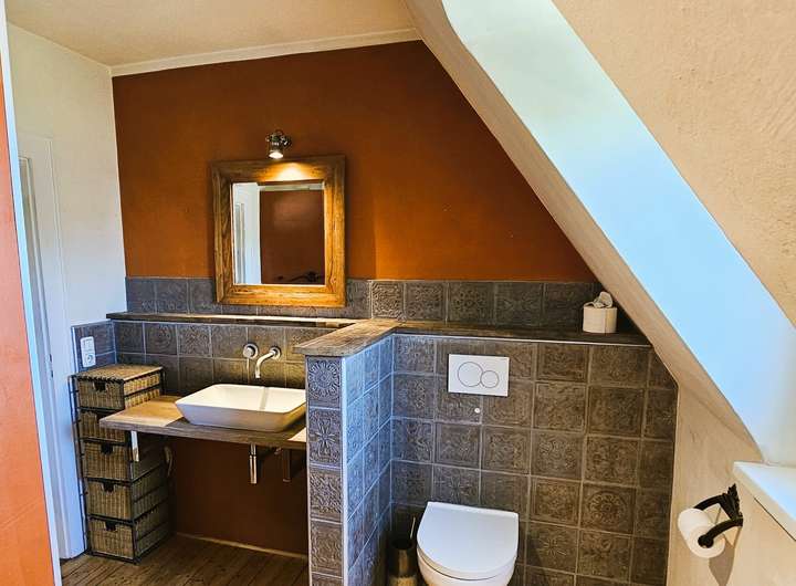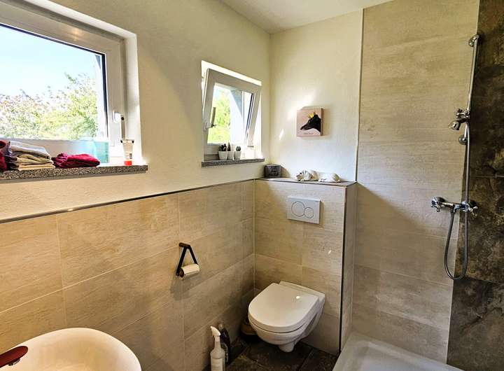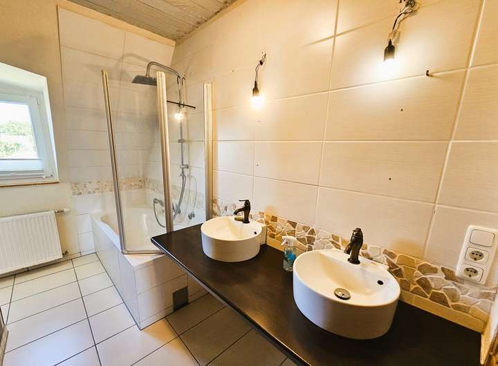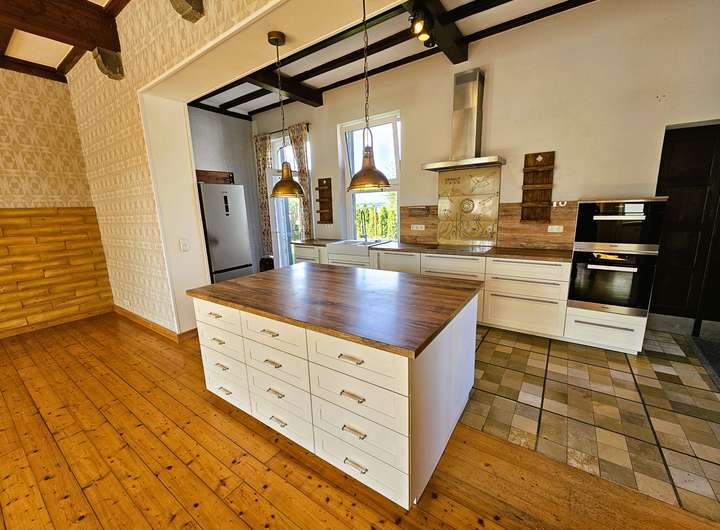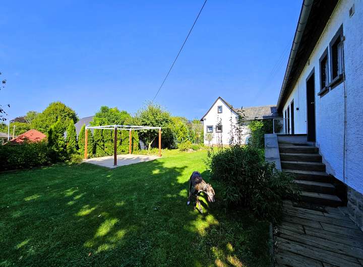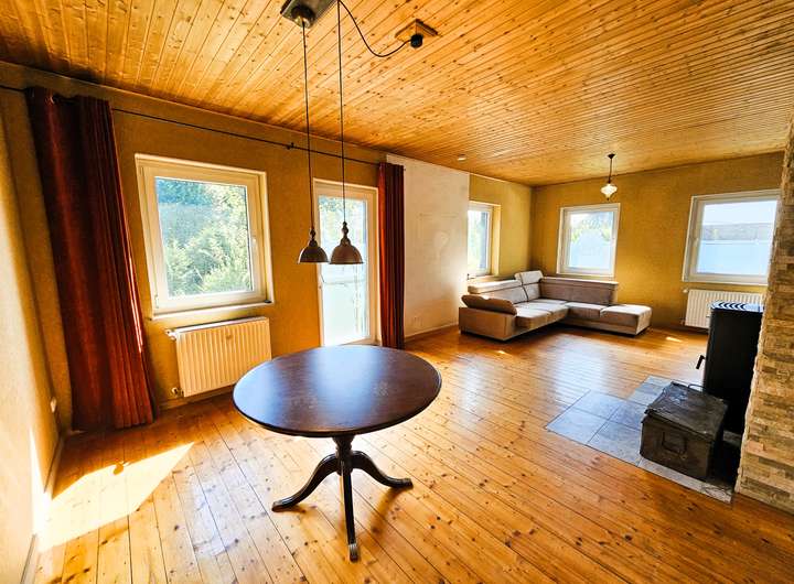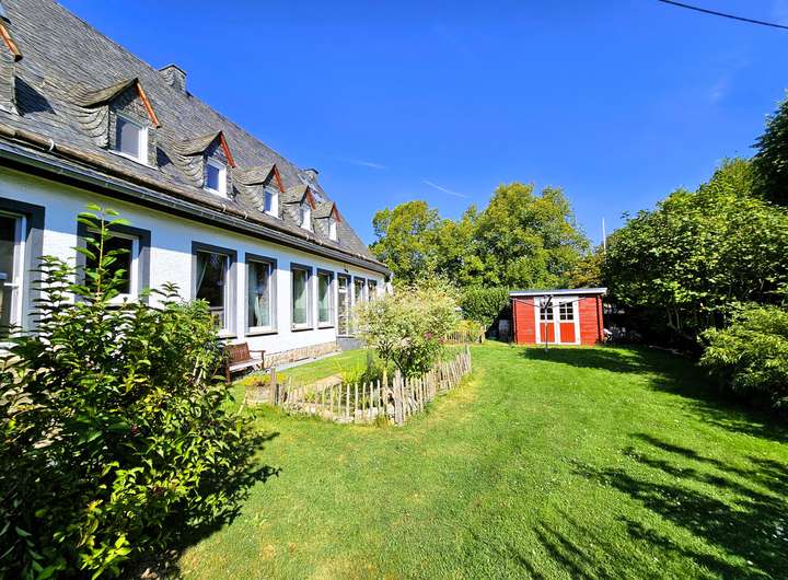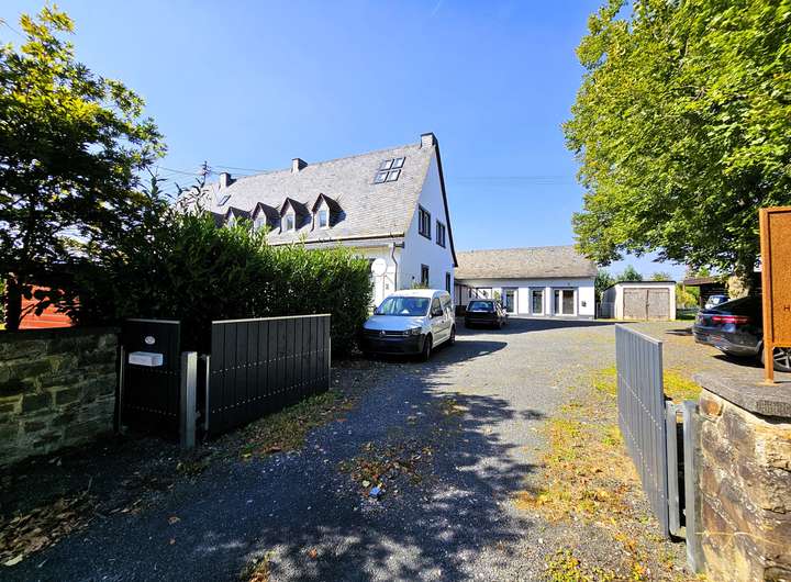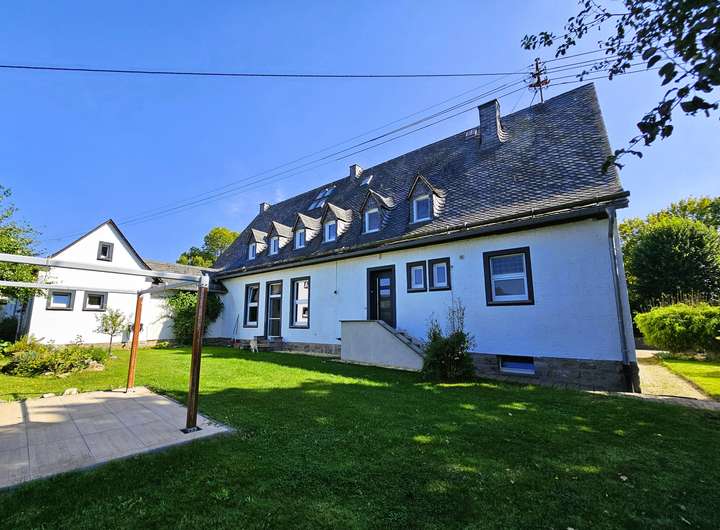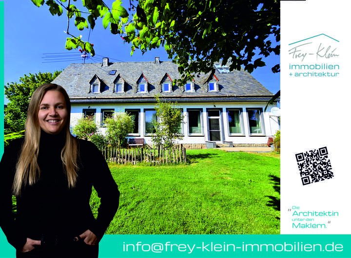 Allgemeine Immobilienbeschreibung - ehem. Dorfschule incl. Lehrerwohnung, grundbuchtechnische Aufteilung in zwei Eigentumswohnungen - als Einfamilien-/Zweifamilien-/Mehrgenerationenhaus nutzbar (zählertechnische Trennung) - zwei Einbauküchen, eine Teeküche Umgebung/Lage - ländliche Umgebung - Autobahnnähe Außenbereich - Garten - Terrasse, Whg. 2 - Einzelgarage - ca. acht Kfz-Stellplätze Bauweise - Massivbauweise (Bims), Bruchsteinmauerwerk (UG) Fenster - 2 und 3-fach Isolierverglasung, teilweise incl. Schallschutz, Kunststoff, Bj. 2019-2022 Energieversorgung - Flüssiggas-Zentral-Heizung, Brenner: Fa. Wolff, Bj. 1999 - Gastank (Eigentum): 5.000 l Fassungsvolumen - Pelletofenöfen: Whg. 1, Fa. Nordic, Bj. 2023; Whg. 2: Fa. Austroflamm, Bj. 2022 (WLAN-fähig) Bodenbeläge - Holzdielen, Fliesen, Parkett Dacheindeckung/Fassade - Naturschiefer Modernisierungs-/Sanierungsmaßnahmen - 2020-2021: Renovierung Anbau - 2019-2022: Austausch fast aller Fenster - 2019: Einfriedung Grundstück - 2021/2022: Badsanierungen Whg. 1 - 2019-2023: neue Gartenanlage incl. Zuwegung Whg. 1 Telefon/Internet: - 250 Mbit/sec bzw. 1.000 Mbit/sec, ohne Gewähr (vodafone bzw. O2) - SAT-TV Vermietung: - Praxis für Hunde-Physiotherapie, ca. 39 m², 250,- Euro Warmmiete zzgl. 50,- Euro Betriebskosten - Therapieraum, Teeküche, Bad mit ebenerdiger Dusche 360°-Rundgang: https://tour.ogulo.com/3M6h