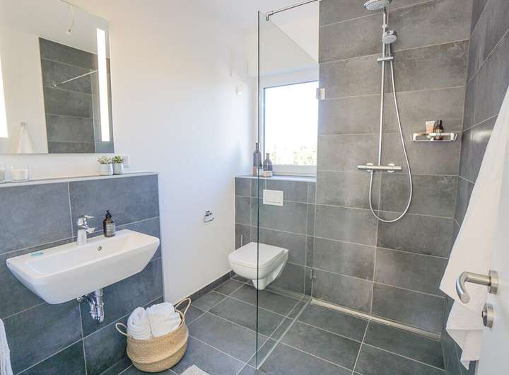 + Tageslichtbad mit bodengleicher Walk-In-Dusche, Waschtisch, WC, Waschmaschinenanschluss und Platz für Trockner