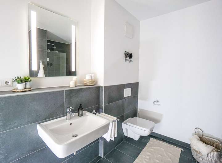 + Tageslichtbad mit bodengleicher Walk-In-Dusche, Waschtisch, WC, Waschmaschinenanschluss und Platz für Trockner