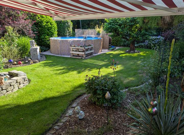 großer, wunderschön angelegter Garten, Aufbaupool,