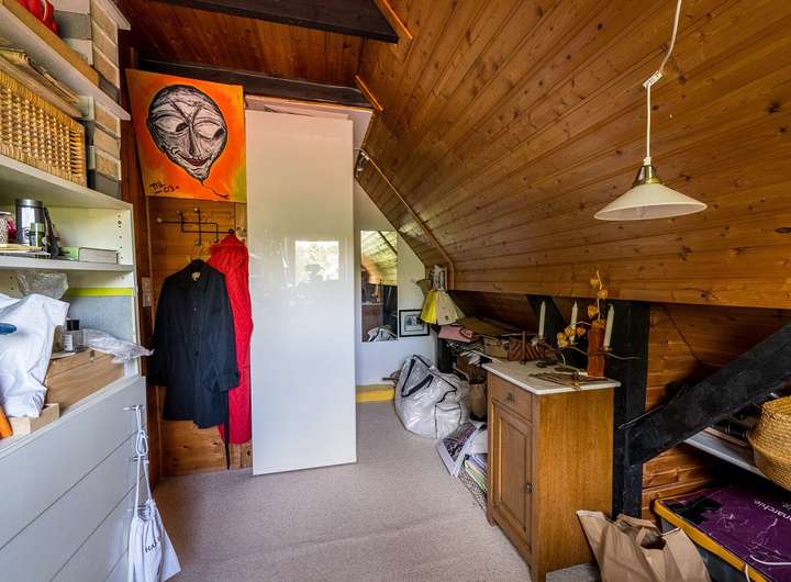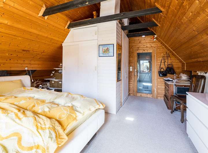 Im Dachgeschoss finden sich ein Schlafzimmer mit praktischen Einbauschränken aus Holz sowie ein kleineres Zimmer, das ebenfalls mit Einbauschränken ausgestattet ist.