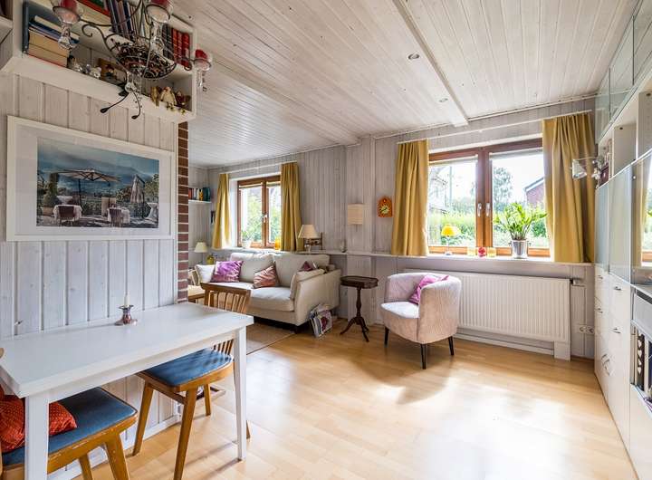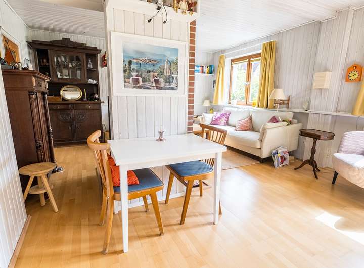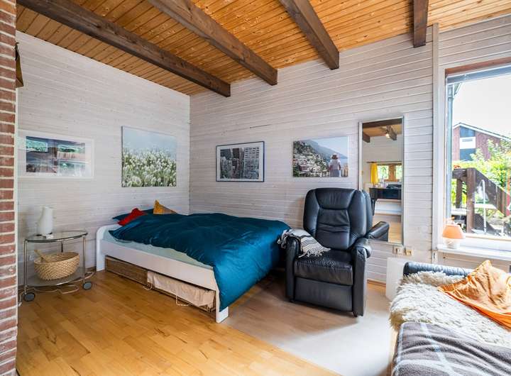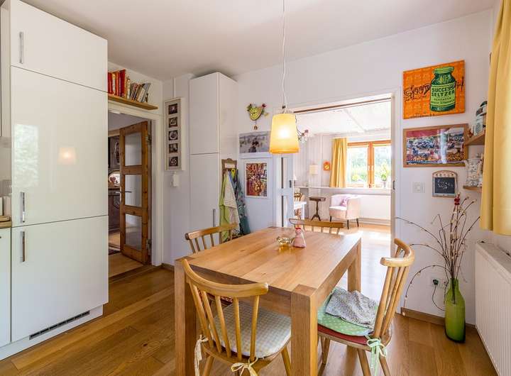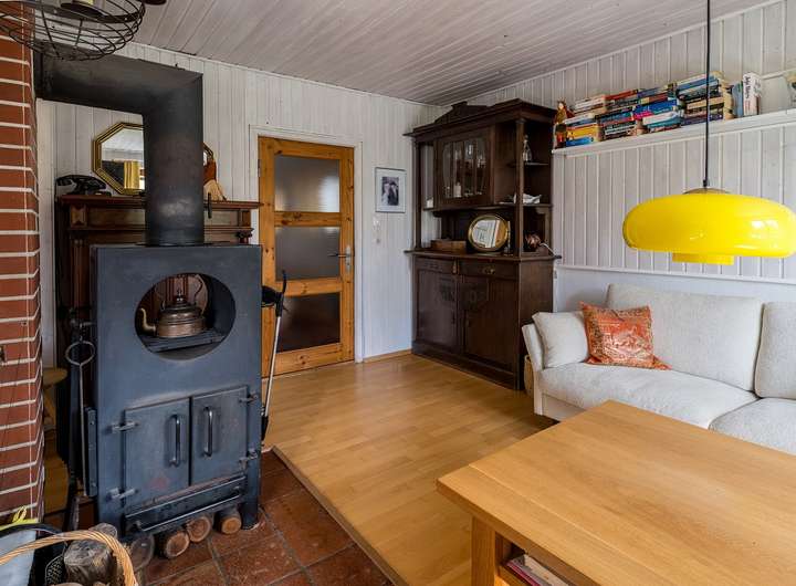 Im Erdgeschoss erwartet Sie zunächst ein gemütlicher Windfang mit anschließendem Flur. Die Küche ist mit einer Einbauküche inklusive Geschirrspüler ausgestattet und verfügt über einen Holzfußboden sowie einen direkten Zugang zur Terrasse. Eine Schiebetür verbindet die Küche mit dem angrenzenden Wohnzimmer, das mit Parkettboden, einer Holzverkleidung sowie einem dänischen Kaminofen mit Bestandsschutz besonders behaglich wirkt. Das moderne Badezimmer mit Dusche und Fliesen in Holzoptik wurde vor etwa acht Jahren erneuert. Der Anbau ergänzt das Erdgeschoss um ein hell gefliestes Gäste-WC mit weißen Keramiken, ein weiteres Badezimmer mit Badewanne und Waschmaschinenanschluss sowie ein großzügiges Zimmer mit Parkettboden, das ursprünglich aus zwei Räumen bestand und bei Bedarf wieder geteilt werden kann.