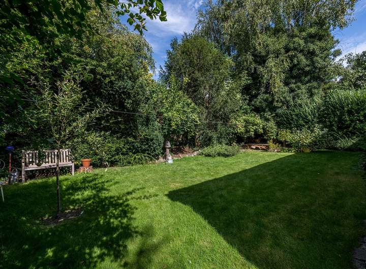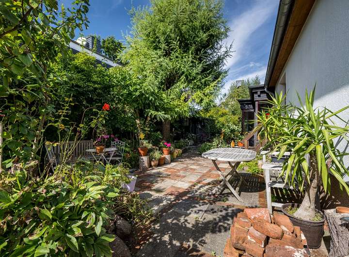 Das Grundstück lädt mit zwei Terrassenbereichen sowie einem kleineren Gartenhaus und einem weiteren Schuppen zum Verweilen und Verstauen ein. Der liebevoll und fast nicht einsehbar angelegte Garten rundet das Gesamtbild ab.