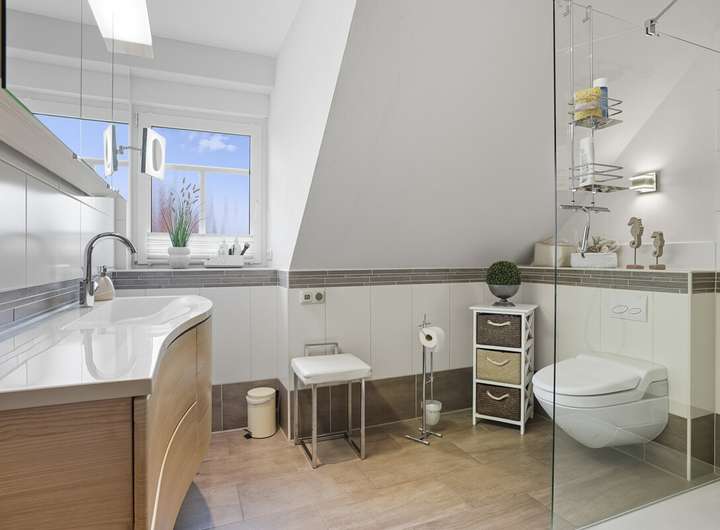 Im Dachgeschoss setzt sich das durchdachte Raumkonzept fort. Der Flur verbindet zwei helle und freundliche Schlafzimmer, die vielseitig genutzt werden können – als Elternschlafzimmer, Kinderzimmer oder Gästezimmer. Das modernisierte Duschbad überzeugt mit hochwertigen Armaturen und durchdachten Details, die den Alltag komfortabel machen. Ein zusätzlicher kleiner Raum eignet sich hervorragend als Ankleide, Büro oder Hobbybereich und rundet das Angebot dieser Etage ab.