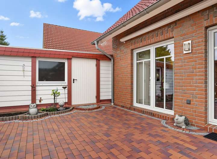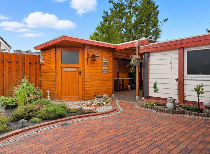 Auch der Außenbereich lässt keine Wünsche offen: Eine sonnige Terrasse lädt zum Entspannen und geselligen Beisammensein ein, während eine windgeschützte, überdachte Terrasse selbst an kühleren Tagen genutzt werden kann. Eine Blockhütte bietet praktischen Stauraum für Gartengeräte.