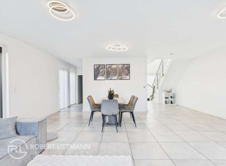 Dieses hochwertige Reihenendhaus besticht durch eine gehobene Ausstattung und moderne Details, die keine Wünsche offen lassen. Im Erdgeschoss begrüßt Sie ein großzügiger Wohn- und Essbereich, der mit einer stilvollen Einbauküche ausgestattet ist. Große Fenster sorgen für eine helle und freundliche Atmosphäre und bieten Zugang zur Terrasse – perfekt für entspannte Stunden im Freien.