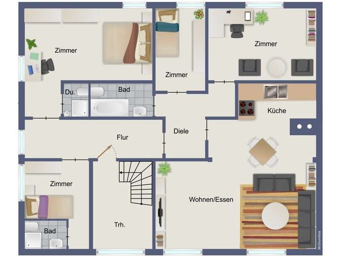 Über das freundliche Treppenhaus gelangen Sie in den Wohnbereich im Obergeschoss. Die Wohnung verfügt über eine Wohnfläche von rund 140 m² und bietet insgesamt fünf Zimmer. Besonders hervorzuheben ist der große Wohn- und Küchenbereich mit moderner Einbauküche, der viel Platz für gemeinsames Leben bietet. Ein Badezimmer mit Badewanne wurde im Jahr 2000 modernisiert, ein weiteres Badezimmer im Jahr 2020 vollständig erneuert. Ergänzt wird die Wohnung durch ein Gäste-WC.