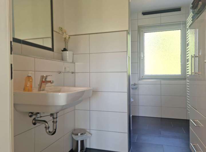 Das Dachgeschoss erreichen Sie über die Treppe im Flur. Dort befindet sich das Schlafzimmer, das ebenfalls über einen Balkonzugang verfügt, sowie das angrenzende Duschbad mit Fenster, das für eine angenehme Belichtung und Belüftung sorgt.