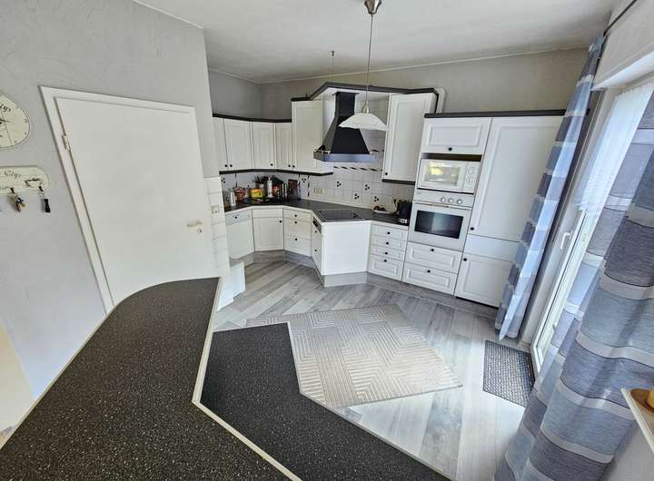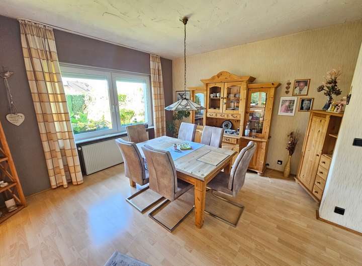 Das Herzstück ist der helle Wohn- und Essbereich mit direktem Zugang zur zweiten Terrasse – ein idealer Ort für gesellige Stunden oder ruhige Abende im Grünen.