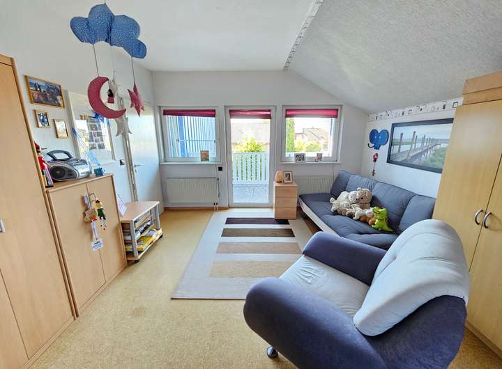 Im Dachgeschoss erwarten Sie zwei Schlafzimmer, ein Bad, ein Hauswirtschaftsraum und ein Balkon mit unverbaubarem Blick ins Grüne.