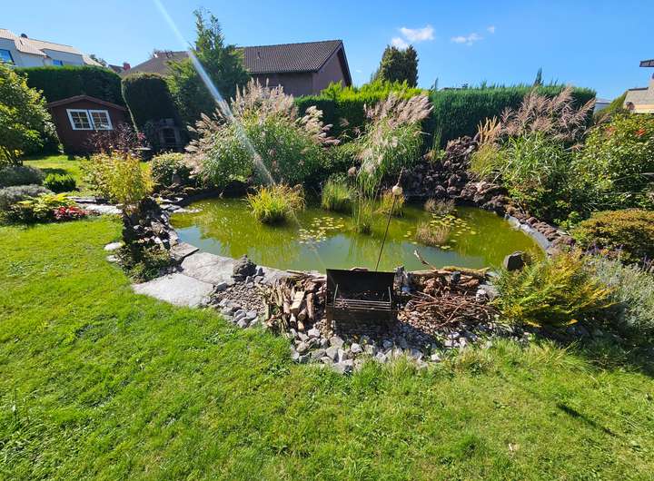 Das gesamte Anwesen ist von einem wunderschön angelegten Garten umgeben – mit gepflegten Rasenflächen, Ziersträuchern und einem kleinen Teich, der eine Oase der Ruhe schafft.
