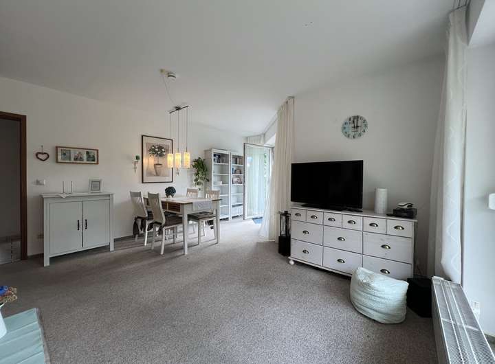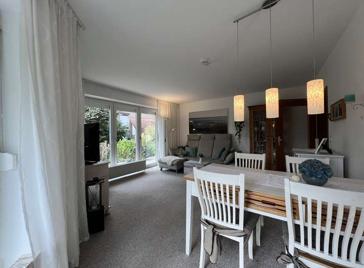 Das Wohn- und Esszimmer ist bietet Zugang zur Süd-Westterrasse. Hier können Sie entspannte Stunden im Freien genießen, während der angrenzende Gartenanteil zusätzlichen Raum für Freizeitaktivitäten bietet. Die Küche ist funktional ausgestattet und bietet zusätzlichen Platz für einen Essbereich.