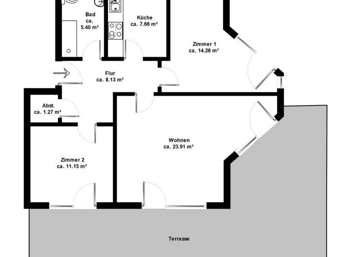 Die Wohnfläche von ca. 70,51 m² verteilt sich auf einen geräumigen Flur, zwei Zimmer, einen Wohn- und Essbereich, die Küche, sowie das Wannenbad.