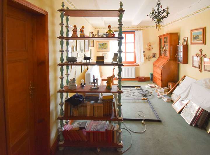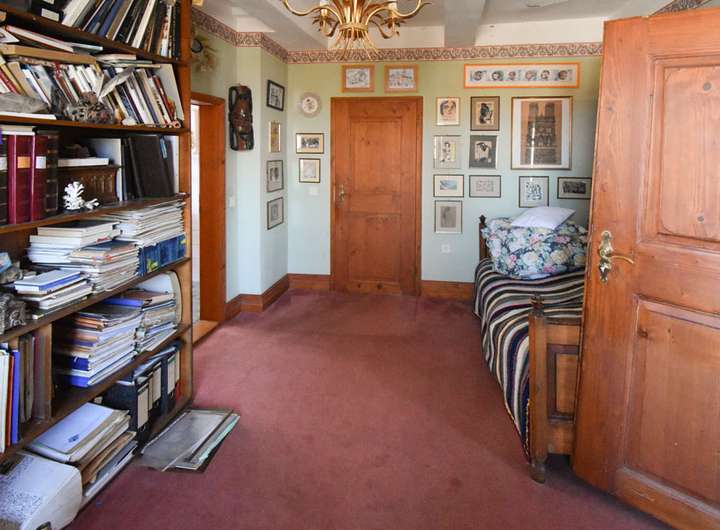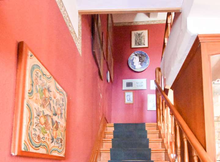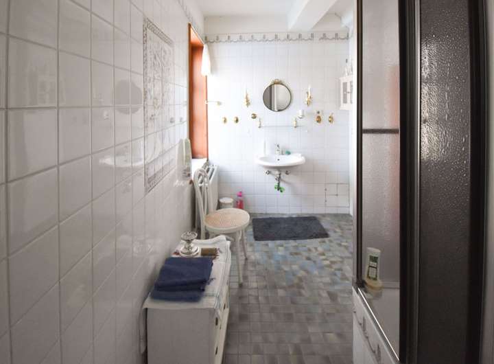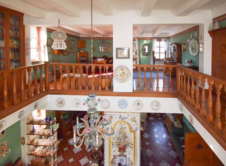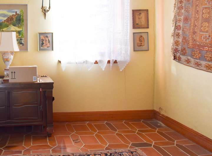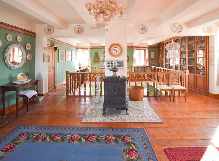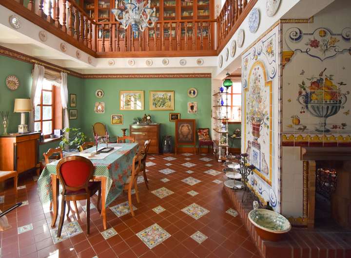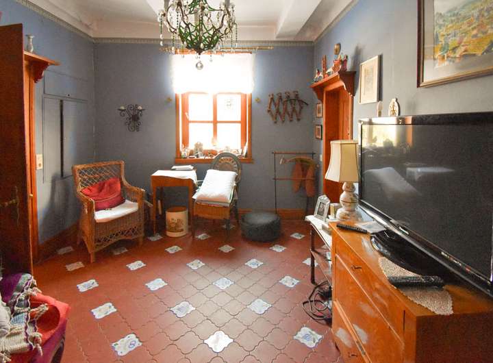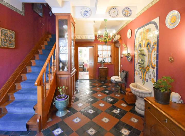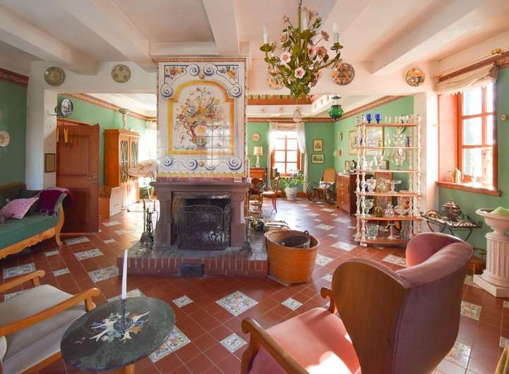 - alte, teils handgemalte Fliesen auf Fußböden, Kamin, Wänden