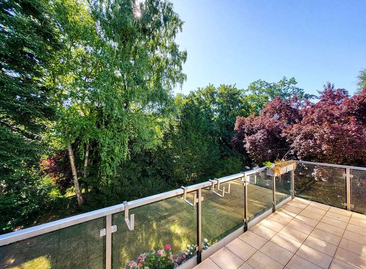 Die Wohnung in der ersten Etage hat einen zum Garten gelegenen, großzügigen Balkon und verfügt teilweise über Parkettböden.