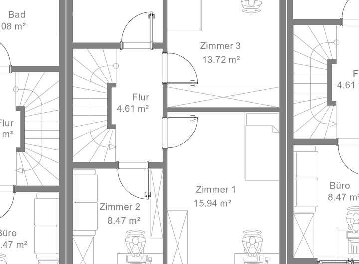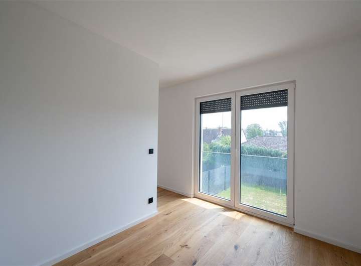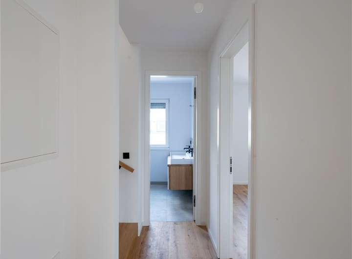 Das Obergeschoss bietet drei gut geschnittene, helle Zimmer (ca. 16 m², 14 m² und 8 m²), die sich flexibel als Kinderzimmer, Gästezimmer oder Homeoffice nutzen lassen. Ein modernes Tageslichtbad (ca. 6 m²) mit bodengleicher Dusche rundet die Ebene ab.