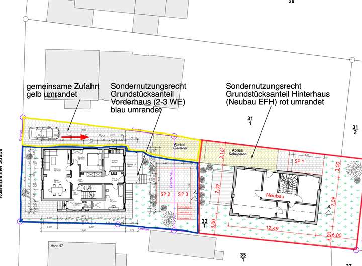 Das Anwesen wird nach Wohnungseigentumsgesetz geteilt. zum hier angebotenen Vorderhaus mit 2-3 Wohneinheiten gehört das alleinige Sondernutzungsrecht von ca. 272 m² plus 50% Anteil der ca. 80 m² großen gemeinsamen Zufahrt.