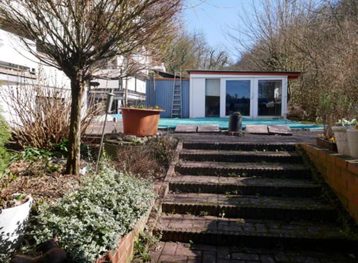 4,60 x 7,25 m, 1,35 m tief, Solaranlage und Gegenschwimmanlage. Ebenfalls gehört noch ein Poolraum dazu, dieser kann von der Garage oder vom Hof aus erreicht werden.