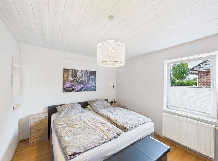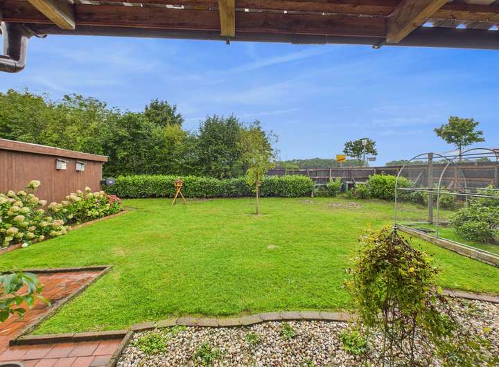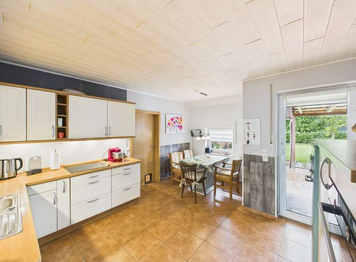 Im Erdgeschoss empfängt Sie ein einladender Flur, von dem aus alle Räume bequem erreichbar sind. Hier befinden sich ein Schlafzimmer, die Küche mit praktischem Hauswirtschaftsraum, ein Badezimmer sowie das helle Wohnzimmer. Große Fenster lassen viel Tageslicht herein und schaffen eine freundliche Wohnatmosphäre. Von der Küche aus gelangen Sie direkt über die überdachte Terrasse in den Garten. Die überdachte Terrasse lädt zu entspannten Stunden ein. Mit Blick auf den gepflegten Garten, ideal für sonnige Tage und alle, die die Nähe zur Natur schätzen.