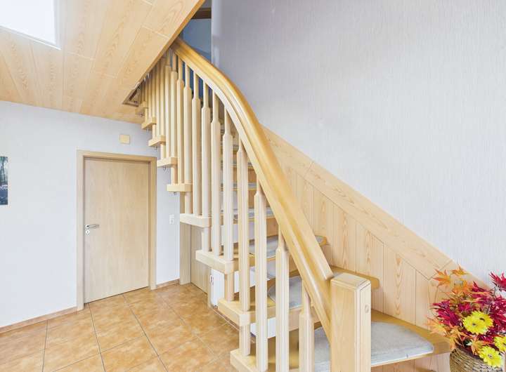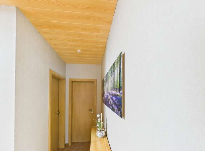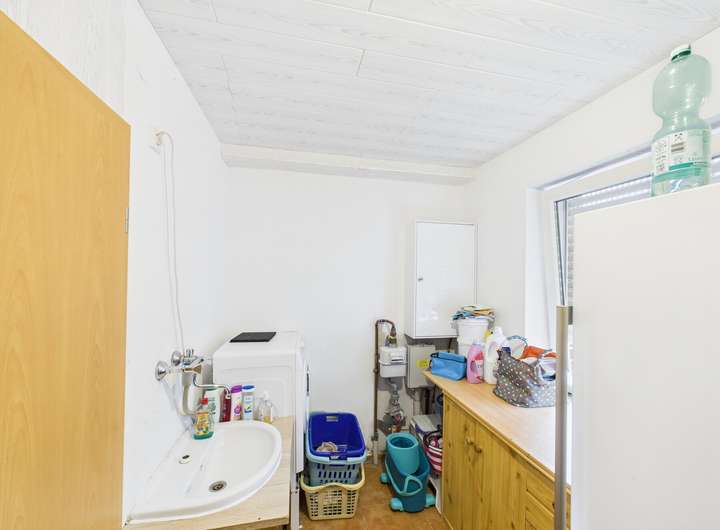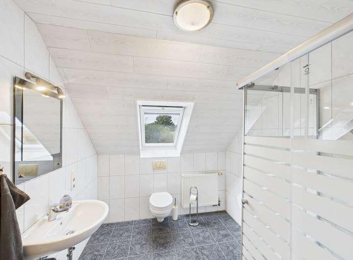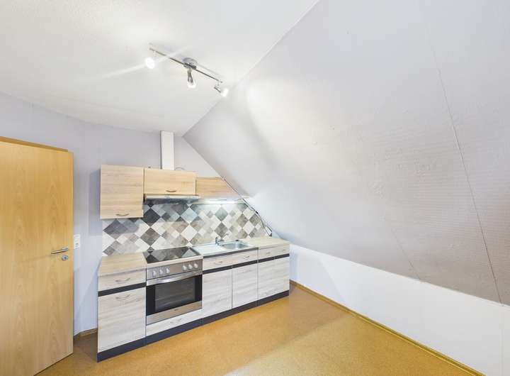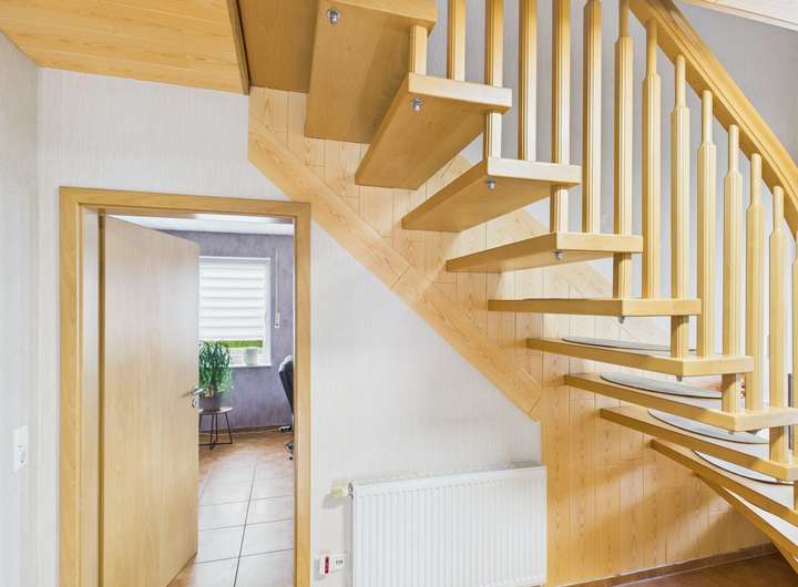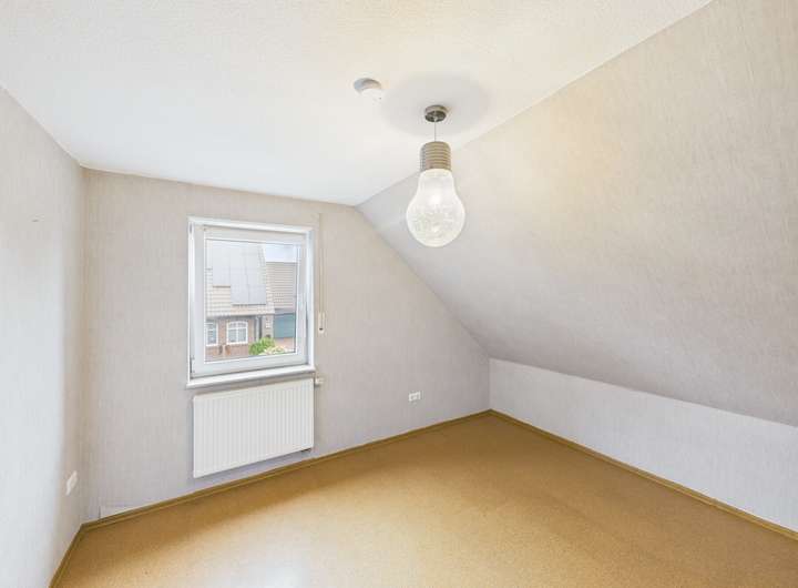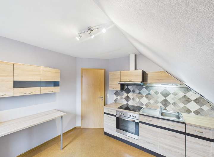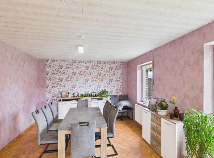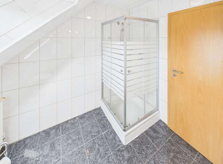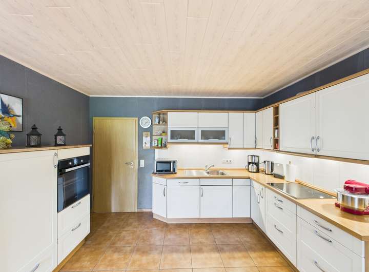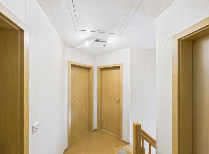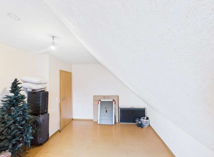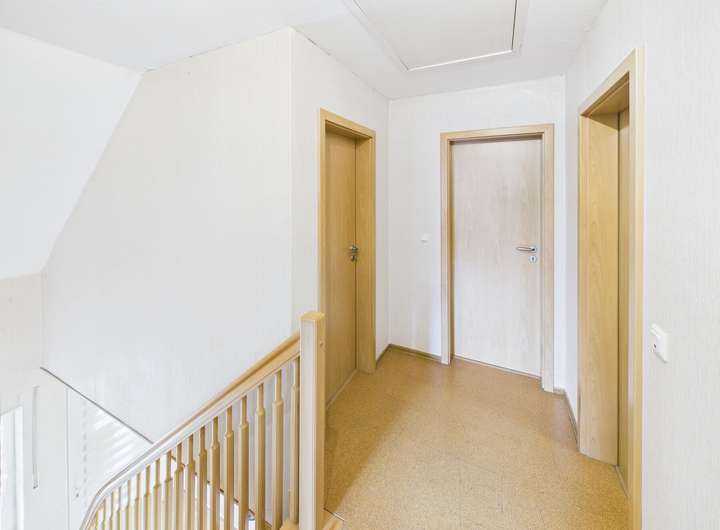 Das Obergeschoss bietet fünf weitere Räume, darunter eine zusätzliche Einbauküche in moderner Hellholzoptik sowie ein Badezimmer mit Dusche. Die übrigen Zimmer lassen sich flexibel nutzen. Entweder als Schlafzimmer, Büro oder Hobbyraum und überzeugen durch ihre angenehme Größe.