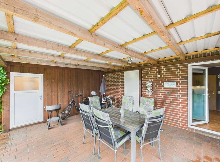 -Überdachte Terrasse mit Blick auf den gepflegten Garten