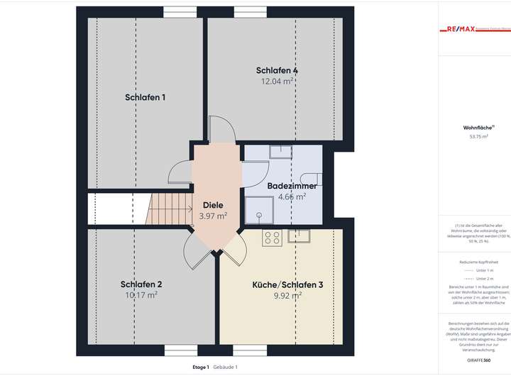 Gesamte Wohnfläche Dachgeschoss: 53,75 m²