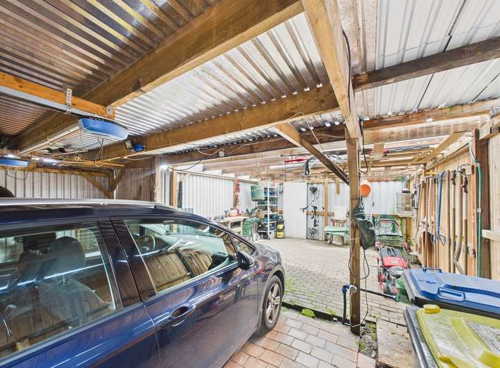 Eine Doppelgarage mit elektrischen Toren bietet Platz für zwei Fahrzeuge und ein direkt angrenzender Geräteraum rundet dieses attraktive Angebot ab.