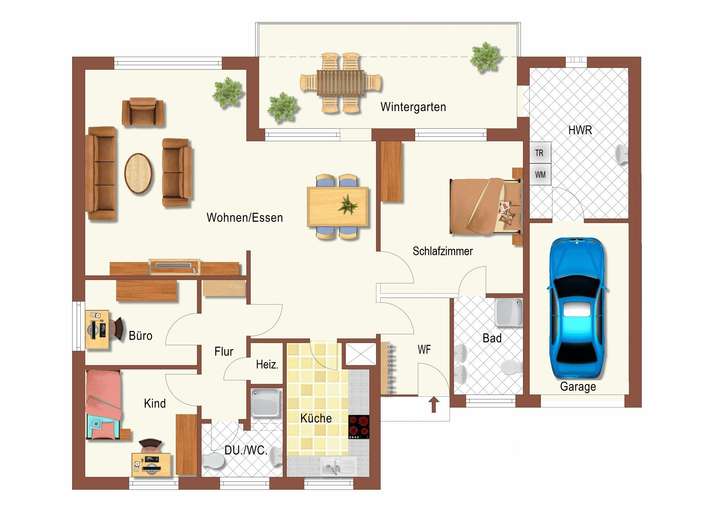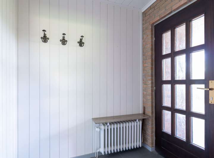 Durch die Haustür betreten Sie zunächst den einladenden Windfang, der mit modernen, anthrazitfarbenen Bodenfliesen sowie einer praktischen Garderobe ausgestattet ist.