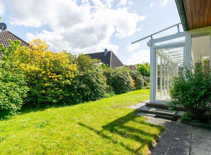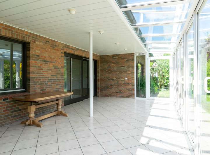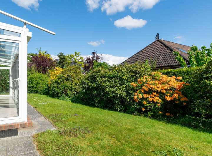 Ein echtes Highlight dieser Immobilie ist der großzügige Wintergarten – ein lichtdurchfluteter Rückzugsort mit hellen Bodenfliesen, großflächiger Fensterfront und direktem Zugang zum Garten. Die Schiebefunktion der Fensterfront ermöglicht es, den Raum im Handumdrehen in eine überdachte Terrasse zu verwandeln. Fußbodenheizung und eine elektrisch steuerbare Markise sorgen für angenehmen Komfort zu jeder Jahreszeit. Der angrenzende, gepflegte und blickgeschützte Garten lädt zum Entspannen, Gärtnern und geselligen Beisammensein ein.