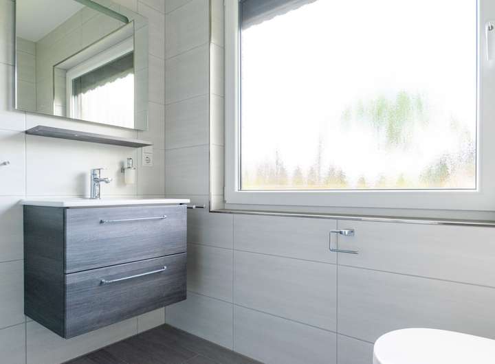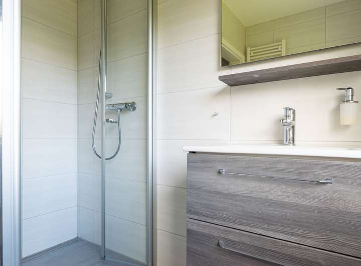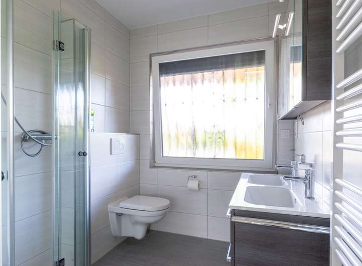 Rechts vom Wohnzimmer gelangen Sie in das gut geschnittene Schlafzimmer, das mit hellem Vinylboden ausgestattet ist. Hier finden problemlos ein großes Doppelbett und ein Kleiderschrank Platz. Direkt angrenzend befindet sich das stilvolle Bad en Suite – Ihr privater Rückzugsort. Dieses wurde 2018 umfassend modernisiert und präsentiert sich mit grauen Bodenfliesen sowie beigen, deckenhohen Wandfliesen in zeitlosem Design. Die Ausstattung umfasst einen großzügigen Doppelwaschtisch mit Spiegelschrank samt Beleuchtung, eine ebenerdige Dusche mit integrierter Sitzmöglichkeit, ein WC, einen Handtuchhalter sowie einen modernen Handtuchheizkörper.