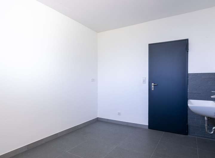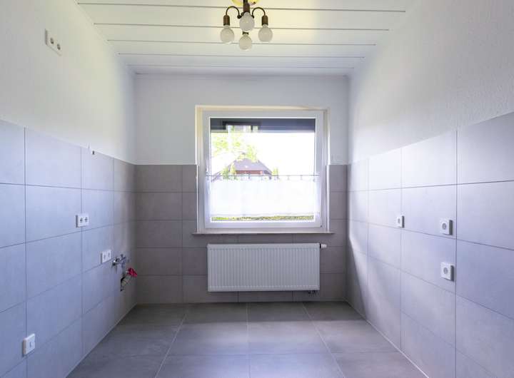 Zur linken Seite des Wohnzimmers befindet sich die separate Küche, die gerade erst mit großformatigen, grauen Bodenfliesen sowie etwas helleren Wandfliesen ausgestattet wurde. Eine Einbauküche ist nicht vorhanden, sodass Sie den Raum ganz individuell und nach Ihren eigenen Vorstellungen gestalten können.