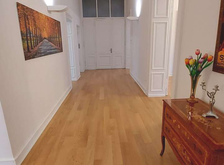Die Wohnung wurde aufwendig und umfangreich saniert. Hierbei ist der Spagat von modernster Technik verbunden mit dem ursprünglichen Charme der Gründerzeit vorbildlich gelungen. So genießen Sie beispielsweise den Komfort einer Fußbodenheizung, während Sie auf dem Holzparkettboden wandeln und gleichzeitig den Blick an die 3,80 m hohen Decken richten, mit den aufwendig restaurierten Stuckrosetten und Gesimsen.