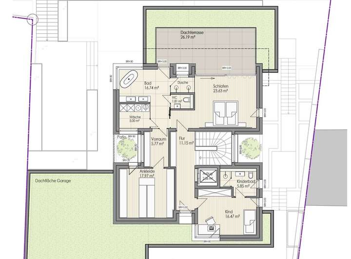 Das Obergeschoss überzeugt mit einer durchdachten und zugleich repräsentativen Raumgestaltung. Der private Elternbereich umfasst ein großzügiges Schlafzimmer mit Zugang zur Dachterrasse und einem luxuriösen Badezimmer. Die freistehende Badewanne, eine bodengleiche Dusche und hochwertige Sanitärelemente lassen keine Wünsche offen. Hier verbinden sich hochwertige Ausstattung und moderner Komfort zu einer wahren Wohlfühloase. Ein angrenzendes Ankleidezimmer sorgt für zusätzlichen Luxus und bietet reichlich Platz für eine stilvolle Garderobe. Auch der Nachwuchs genießt einen eigenen Rückzugsbereich: Das helle Kinderzimmer verfügt über ein separates, direkt angeschlossenes Kinderbad – ideal, um Privatsphäre und Komfort für jedes Familienmitglied zu gewährleisten.