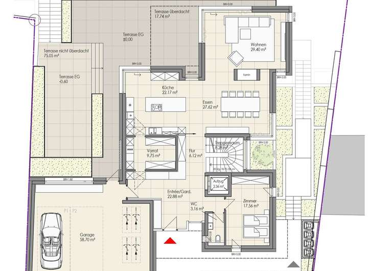 Beim Betreten des Hauses empfängt Sie ein großzügiger Eingangsbereich mit direktem Zugang zu allen Bereichen des Erdgeschosses. Herzstück der Ebene ist der offen gestaltete Wohn- und Essbereich, der mit viel Tageslicht und fließenden Übergängen ein harmonisches Wohngefühl vermittelt. Von hier aus genießen Sie während des Essens den wunderbaren Fernblick in Richtung Westen. Angrenzend befindet sich die offene Küche, die durch eine praktische Vorratskammer ergänzt wird. Ein separates Schlafzimmer samt Gäste-WC bietet flexible Nutzungsmöglichkeiten, sei es als Arbeits- oder Gästezimmer. Vom Eingangsbereich aus ist zudem ein direkter Zugang zur Doppelgarage gegeben, der kurze Wege gewährleistet. Ein Personenaufzug bringt Sie komfortabel in das Gartengeschoss oder in das Obergeschoss.