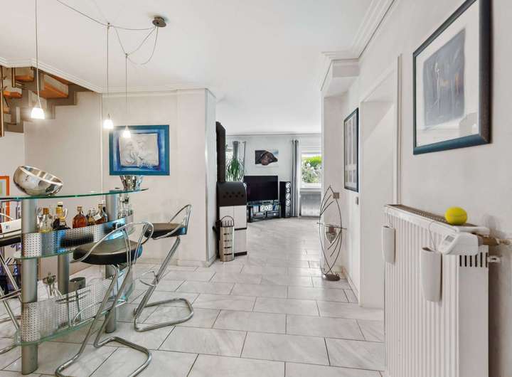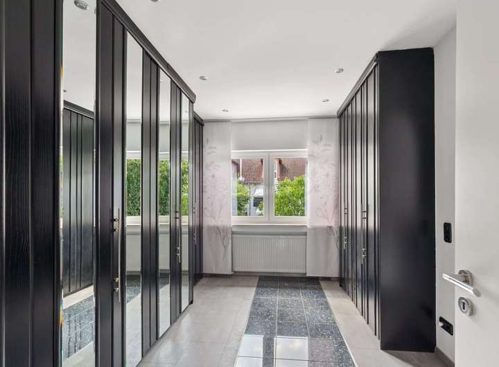 Schon beim Betreten spüren Sie die besondere Ausstrahlung dieses Hauses. Der Windfang empfängt Sie mit einem Hauch von Privatsphäre, bevor Sie in den großzügigen Korridor treten, der, wie das gesamte Erdgeschoss, mit edlen, matten Marmorfliesen ausgelegt ist – ein echter Blickfang.