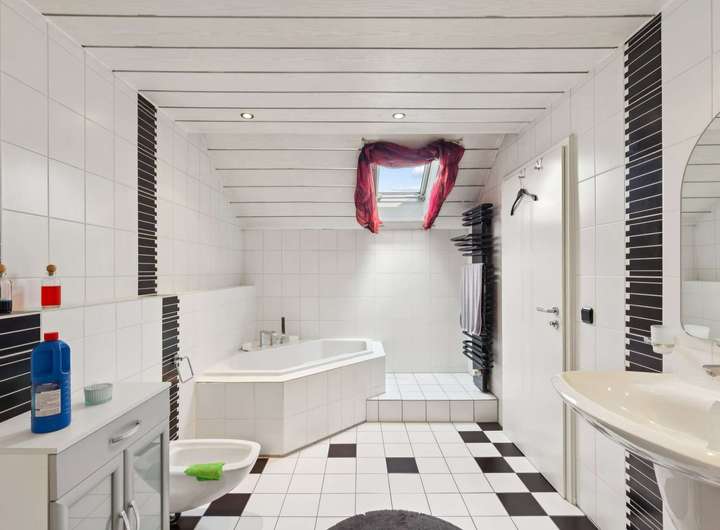 •	Das Tageslicht-Badezimmer ist ein echtes Highlight: stilvoll und großzügig gestaltet mit einer eleganten Eckbadewanne, WC, Bidet und einer separaten Dusche im zeitlosen Schwarz-Weiß-Design – hier trifft Funktionalität auf Ästhetik.