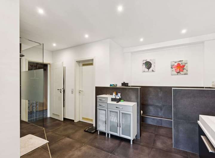 •	Das moderne Badezimmer ist ein Wellness-Traum: Doppelwaschbecken, Whirlpoolwanne, separate Dusche mit Rainshowerfunktion und Seitendüsen, WC und Bidet hinter einer kleinen Wand – luxuriös und durchdacht. Hier können Sie entspannt in den Tag starten!